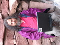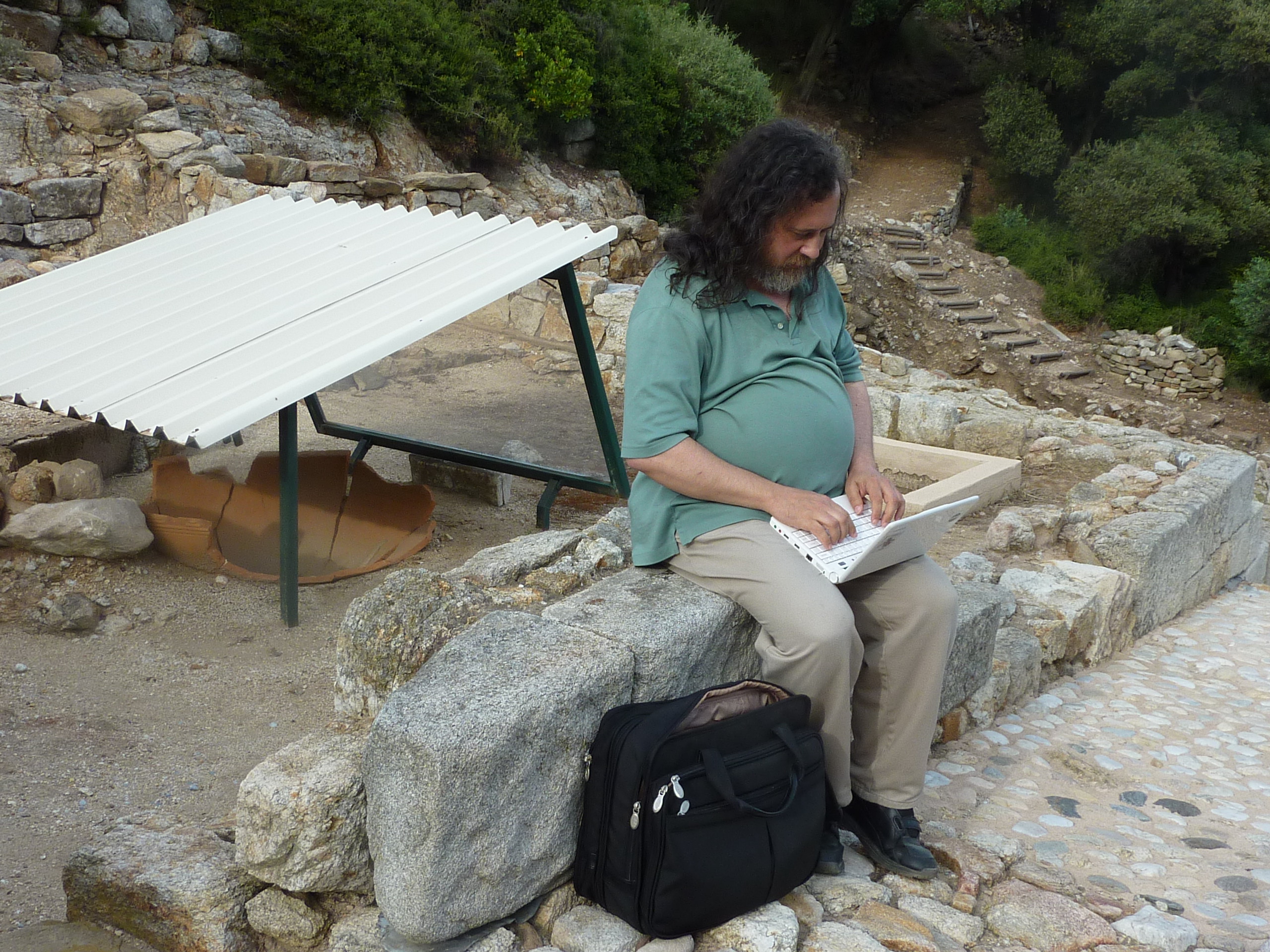 RMS outside on a lush rocky hill with his laptop.