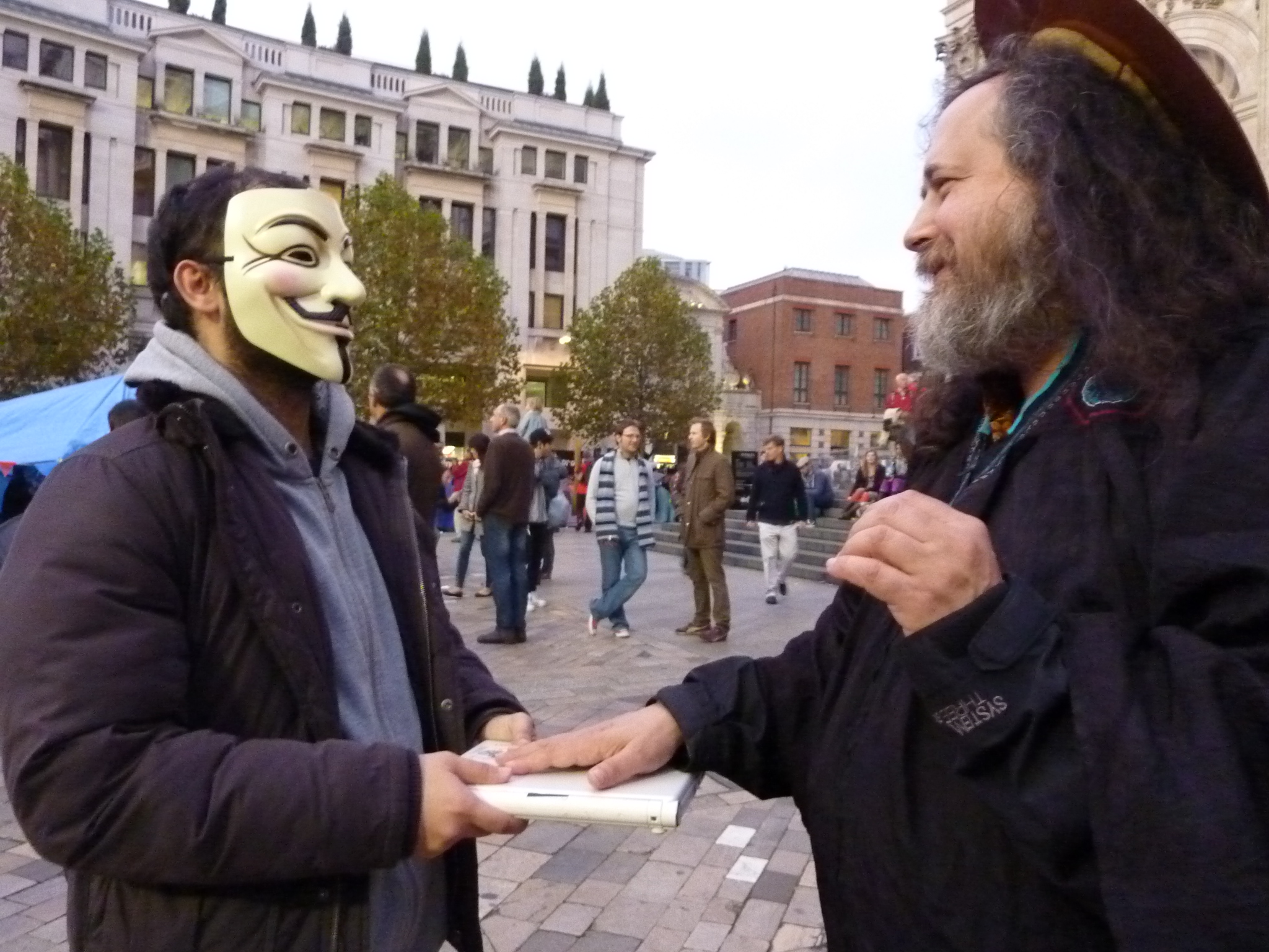 RMS woking, GNU sticker covering IBM Logo.